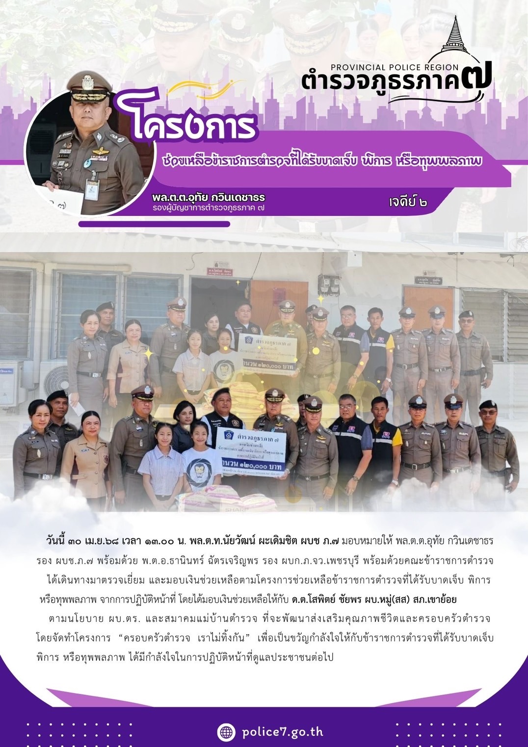 วันที่ 30 เม.ย.68 เวลา 13.00น. ♦️พล.ต.ท.นัยวัฒน์ ผะเดิมชิต ผบช.ภ.7 มอบหมายให้ พล.ต.ต.อุทัย กวินเดชาธร รอง ผบช.ภ.7