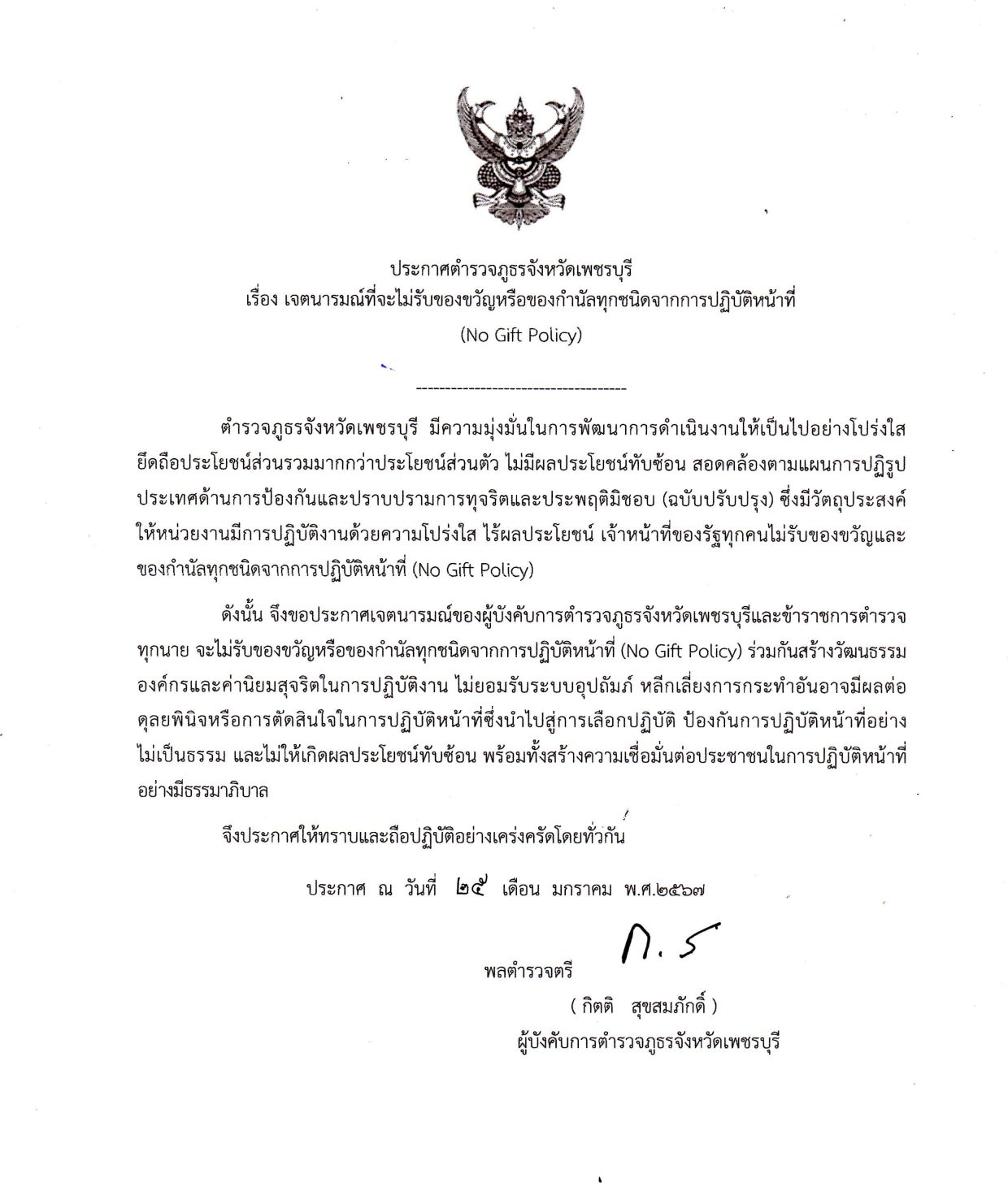 ประกาศนโยบายต่อต้านการรับสินบน (Anti-Bribery Policy) ตำรวจภูธรจังหวัดเพชรบุรี 25 มกราคม 2567 โดย adm_phetchaburi adm_phetchaburi / ข่าวประกาศและคำสั่ง,ข่าวประชาสัมพันธ์ ฉบับภาษาไทย ฉบับภาษาอังกฤษ Post Views: 88