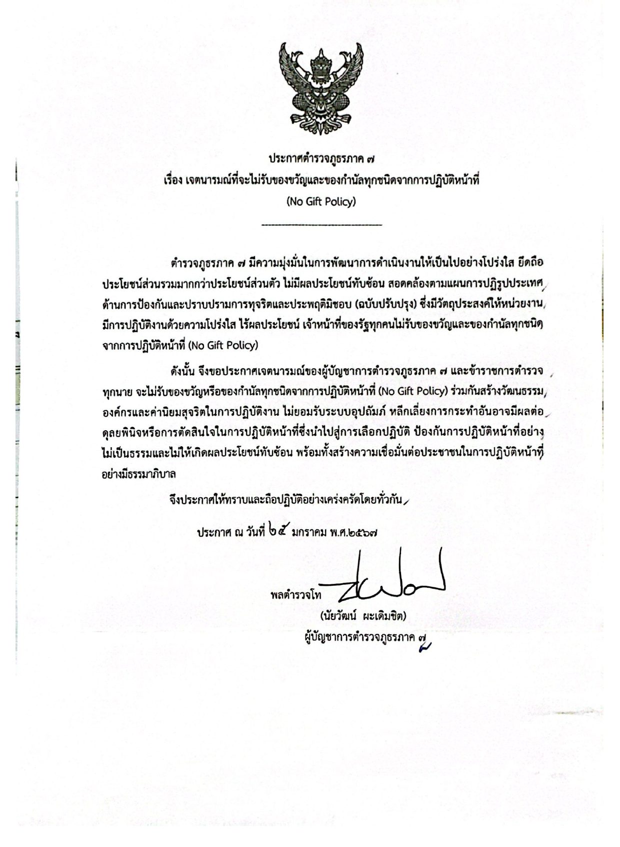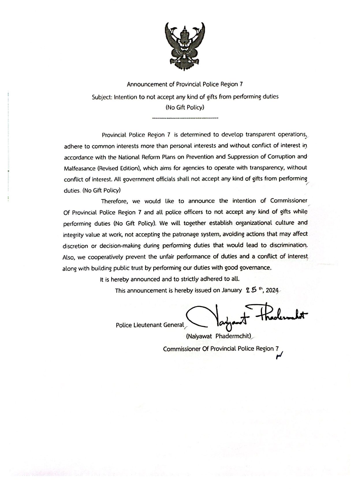 ประกาศนโยบายต่อต้านการรับสินบน (Anti-Bribery Policy) ตำรวจภูธรภาค 7 25 มกราคม 2567 โดย adm_phetchaburi adm_phetchaburi / ข่าวประกาศและคำสั่ง,ข่าวประชาสัมพันธ์ ฉบับภาษาไทย ฉบับภาษาอังกฤษ Post Views: 53