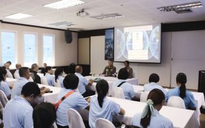 วันที่ 22 ก.พ.2567 เวลา 14.00 น. พ.ต.อ.ธงชัย เนตรสขาวัฒน์ รอง ผบก. ภ.จว.เพชรบุรี พร้อมด้วย พ.ต.ต.หญิงจิราภา แจ่มแสง สว.(สอบสวน) สภ.เมืองเพชรบุรี ร่วมเป็นวิทยากรบรรยายพิเศษ เรื่องการเพิ่มประสิทธิภาพการปฎิบัติงานของสำนักงานกองบัญชาการ กองบัญชาการกองทัพไทย ภายใต้หัวข้อ “ภัยคุกคามสื่อออนไลน์ในปัจจุบัน” ณ บ้านพักรับรอง 17 หาดเจ้าสำราญ จว.เพชรบุรี โดยมีผู้เข้าร่วมการฟังบรรยายเป็นข้าราชการทหารในส่วนของกองบัญชาการกองทัพไทยจำนวน 80 นาย