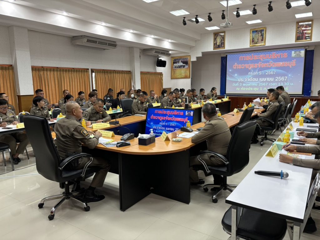 วันที่ 3 พ.ค.67 เวลา 13.30 น. พล.ต.ต.กิตติ สุขสมภักดิ์ ผบก.ภ.จว.เพชรบุรี พร้อมด้วย พ.ต.อ.กานต์ ธรรมเกษม รอง ผบก.ภ.จว.เพชรบุรี พ.ต.อ.โกศล ยามา รอง ผบก.ภ.จว.เพชรบุรี พ.ต.อ.ธานินทร์ ฉัตรเจริญพร รอง ผบก.ภ.จว.เพชรบุรี พ.ต.อ.ธงชัย เนตรสขาวัฒน์ รอง ผบก.ภ.จว.เพชรบุรี พ.ต.อ.ธัญญะ ครุฑเผือก รอง ผบก.ภ.จว.เพชรชบุรี หน.สภ.ในสังกัด, ผกก.สส.ฯ, ผกก.(สอบสวน)ฯ, ผกก.ฝอ.ฯ, ฝ่ายอำนวยการ ร่วมประชุม พร้อมด้วยหน่วยงาน ส.ทท.2 กก.1 บก.ทท.3,ส.ทล.2 กก.บก.ทล.,พฐ.จว.เพชรบุรี, กก.5 บก.ปทส.ฯ, ตม.จว.เพชรบุรี, ตำรวจน้ำ, สันติบาลจังหวัดเพชรบุรี และกองร้อย ตชด.144 เข้าร่วมประชุมบริหารราชการ ภ.จว.เพชรบุรี ครั้งที่ 5/2567 ประจำเดือน เม.ย.67 ณ ห้องประชุม 1 ภ.จว.เพชรบุรี และ ข้าราชการตำรวจระดับ รอง ผกก., สว.สภ.ในสังกัด เฝ้าฟัง ณ สภ.ที่ตั้งผ่านระบบทางไกลผ่านจอภาพ (Video Conference)