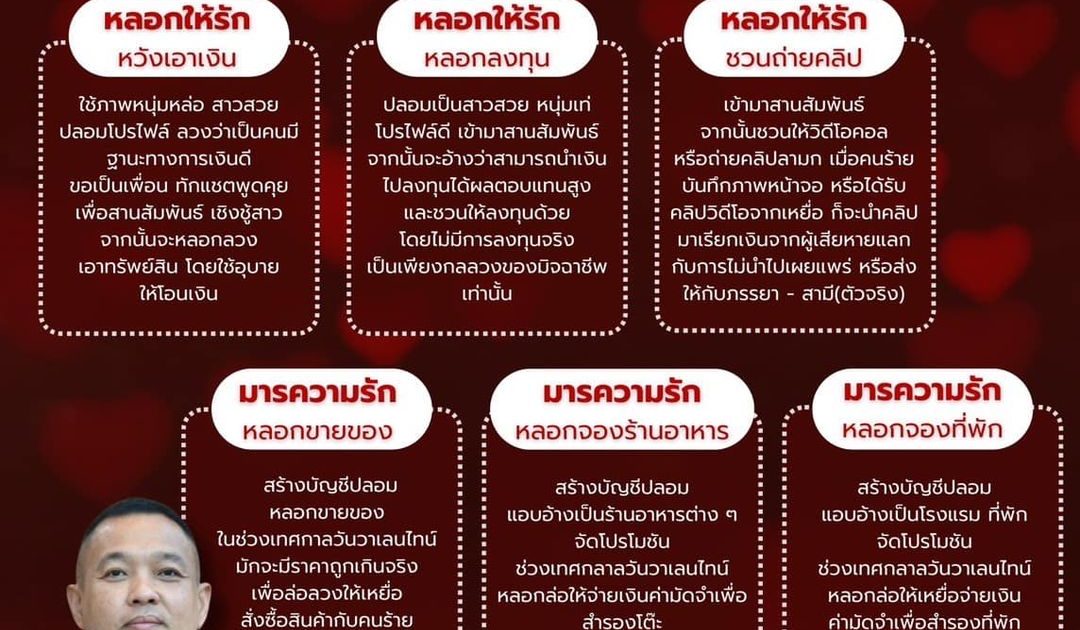 สำนักงานตำรวจแห่งชาติ ขอให้พี่น้องประชาชนอย่าหลงเชื่อในสิ่งที่ราคาถูกหรือดูดีเกินจริง และมัดระวัง “6 โจรความรัก” 6 รูปแบบ กลลวงของมิจฉาชีพในการหลอกลวงแสวงหาประโยชน์จากพี่น้องประชาชนในช่วงเทศกาลวันวาเลนไทน์