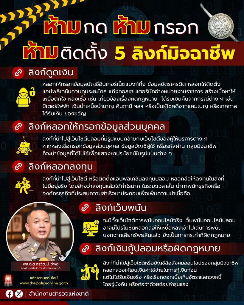 พล.ต.ต.ศิริวัฒน์ ดีพอ รองโฆษกสำนักงานตำรวจแห่งชาติ เตือนภัยออนไลน์ ด้วย พล.ต.อ.ต่อศักดิ์ สุขวิมล ผบ.ตร. ได้มีความห่วงใยพี่น้องประชาชนที่อาจได้รับความเสียหายจากอาชญากรรมรูปแบบต่าง ๆ ซึ่งในปัจจุบันกลุ่มมิจฉาชีพยังคงมีการพัฒนารูปแบบในการหลอกลวงพี่น้องประชาชนอยู่เสมอ มีการนำหลักจิตวิทยา “รัก โลภ ตกใจ เชื่อใจ” มาปรับใช้ในการหลอกล่อให้ผู้เสียหายหลงเชื่อ และมักพบว่ากลุ่มมิจฉาชีพจะมีการนำลิงก์รูปแบบต่าง ๆ มาใช้เป็นเครื่องมือในการกระทำความผิด ถ้าผู้เสียหายหลงเชื่อกดลิงก์ แล้วกรอกข้อมูลหรือติดตั้งแอปพลิเคชันจากลิงก์ดังกล่าว ก็จะตกเป็นเหยื่อของมิจฉาชีพในที่สุด