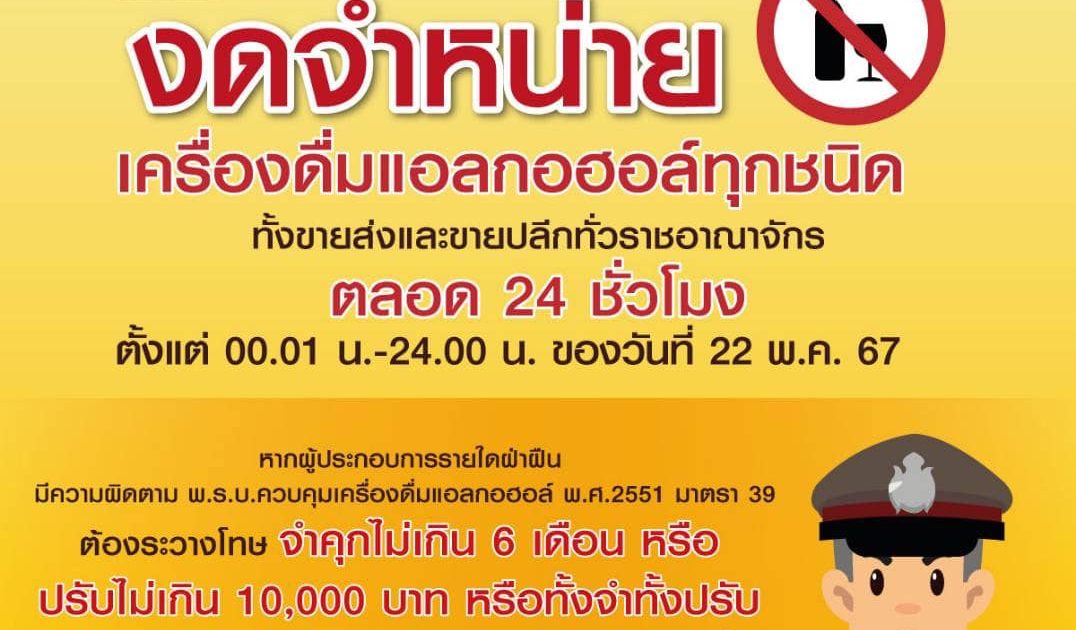 “ได้กำชับให้สถานีตำรวจทุกแห่งประชาสัมพันธ์แจ้งเตือนผู้ประกอบการ ร้านค้าทุกประเภท ทั้งร้านค้าในชุมชน ร้านสะดวกซื้อ ห้างสรรพสินค้า ร้านอาหารที่ขายเครื่องดื่มแอลกอฮอล์ รวมถึงสถานบริการและสถานประกอบการที่เปิดให้บริการลักษณะที่คล้ายสถานบริการ ให้งดขายเครื่องดื่มแอลกอฮอล์ทุกชนิด ทั้งชนิดขายส่งและขายปลีกทั่วราชอาณาจักร ตลอด 24 ชั่วโมง ระหว่างเวลา 00.01 – 24.00 น. ของวันที่ 22 พฤษภาคม 2567 ยกเว้นเฉพาะร้านค้าปลอดอากรภายในอาคารท่าอากาศยานนานาชาติ หากผู้ใดฝ่าฝืน มีความผิดตามพระราชบัญญัติควบคุมเครื่องดื่มแอลกอฮอล์ พ.ศ.2551 มาตรา 39 ต้องระวางโทษจำคุกไม่เกิน 6 เดือน หรือปรับไม่เกิน10,000 บาท หรือทั้งจำทั้งปรับ”