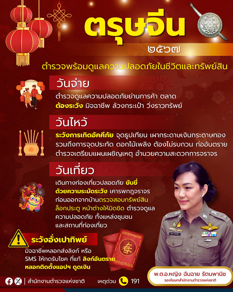 ผบ.ตร. สั่งการ 4 มาตรการให้ตำรวจดูแลประชาชน เพิ่มความเข้มงวด ด้านความปลอดภัยในชีวิตและทรัพย์สิน อำนวยความสะดวกด้านการจราจร ป้องกันมิจฉาชีพฉวยโอกาสในเทศกาล “ตรุษจีน 2567″