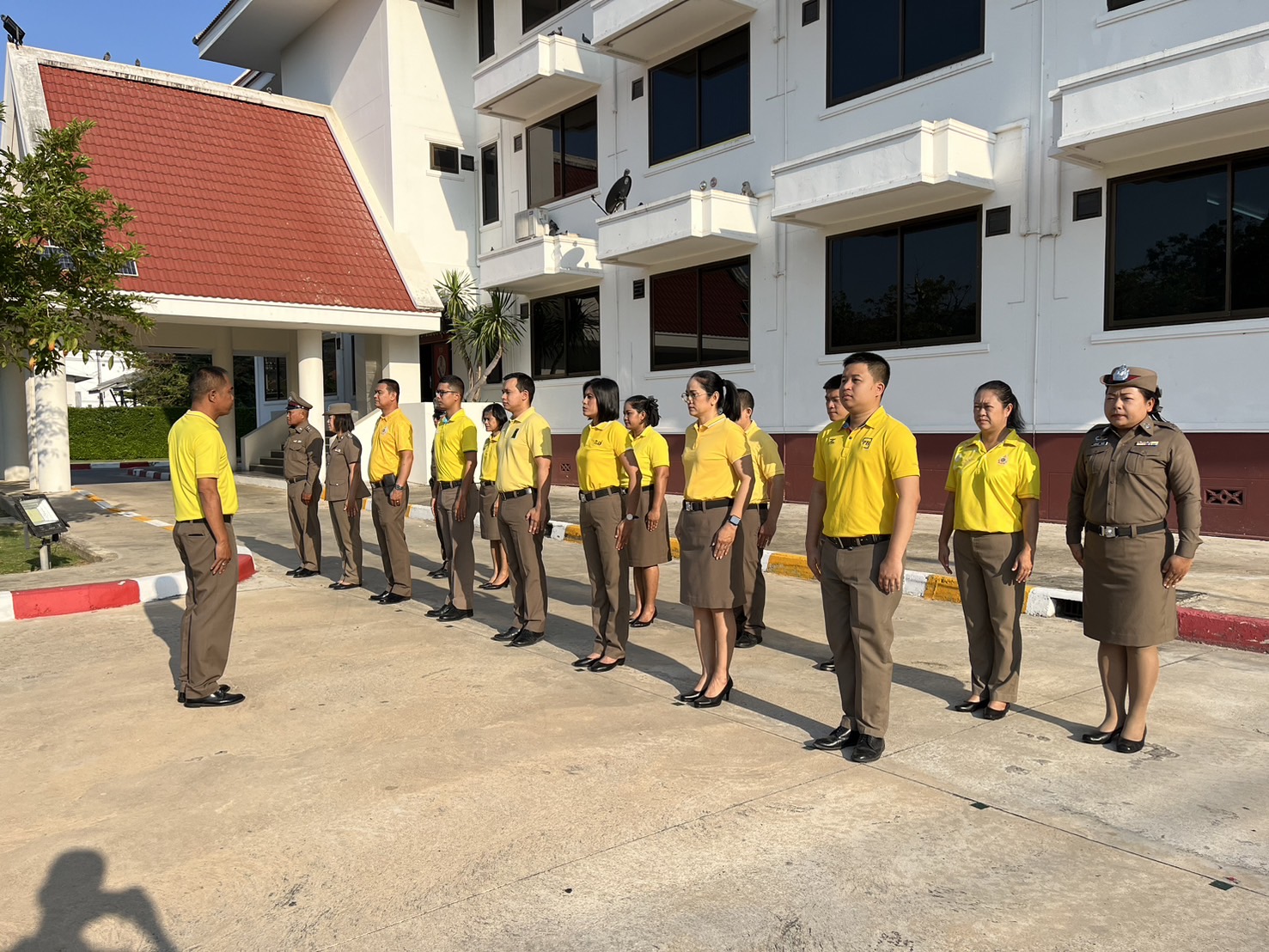 ตำรวจภูธรจังหวัดเพชรบุรี โดยข้าราชการตำรวจ ฝอ.ภ.จว.เพชรบุรี เข้าแถวเคารพธงชาติ และชี้แจงข้อราชการ ณ หน้าอาคารที่ทำการ ภ.จว.เพชรบุรี